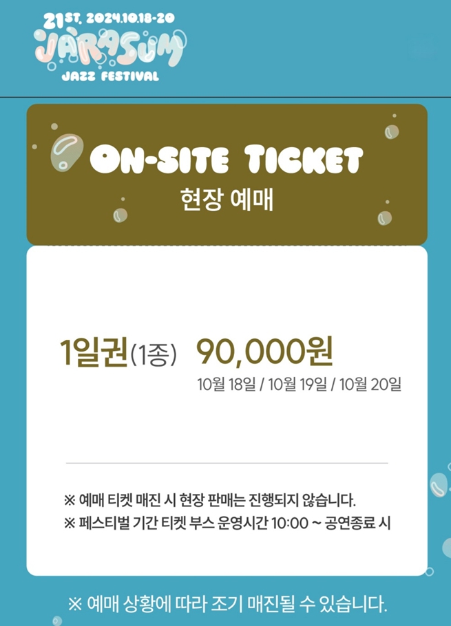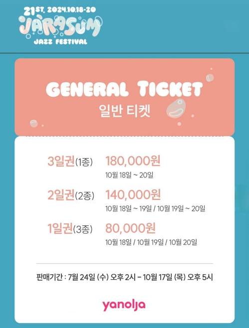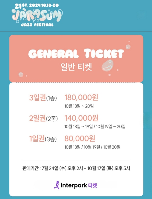 10월에 있을 3일간의 재즈페스티벌을 캠핑장에서 머무르며 여유롭게 즐길 수 있도록 미리 티켓예매와 캠핑장 서둘러 예약을 해두시는 것을 추천드립니다.